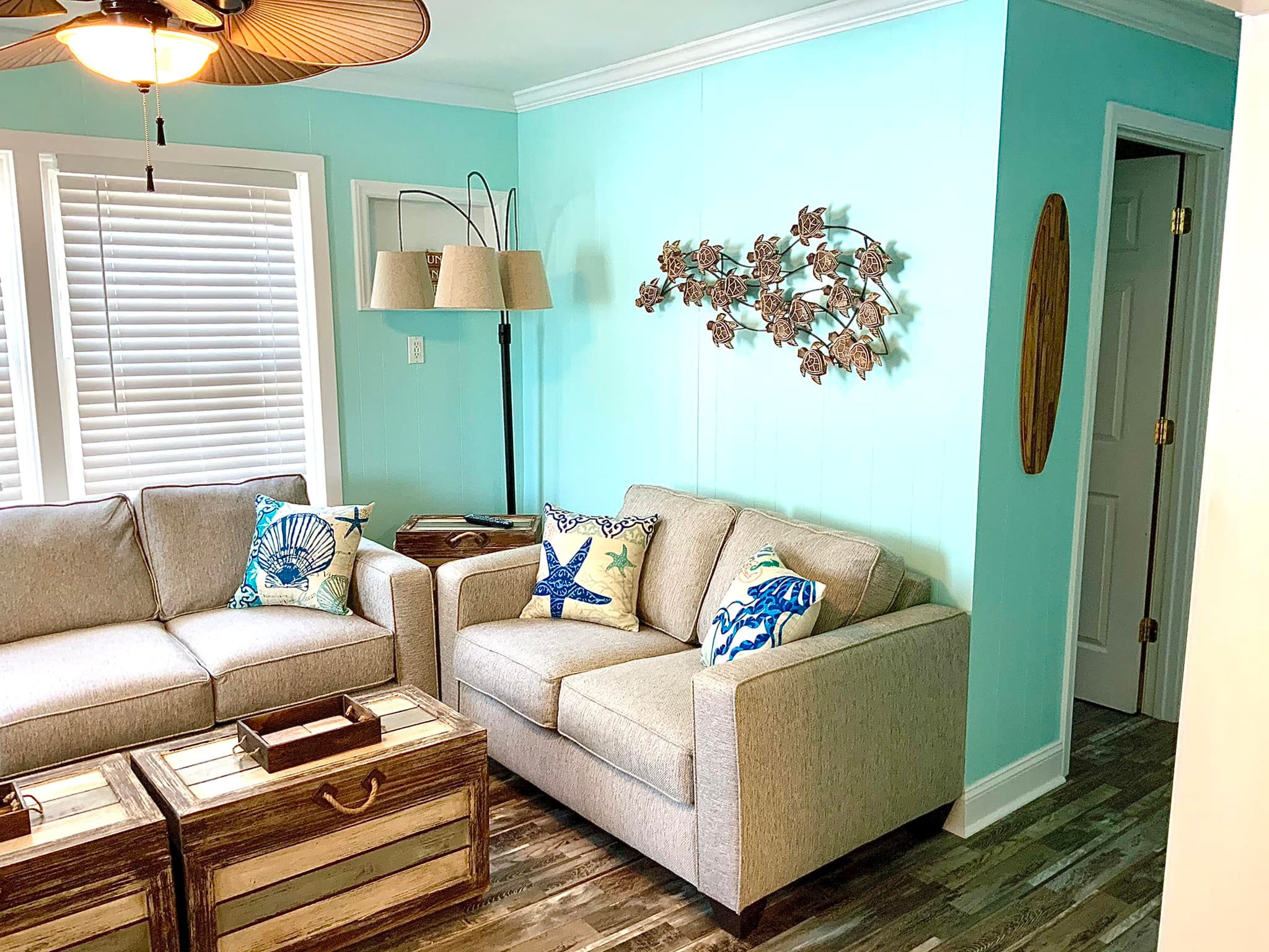 This rental comes with a golf cart, wifi, and extended cable. Custom outdoor surfboard shower. Flat screen TVs in each room.