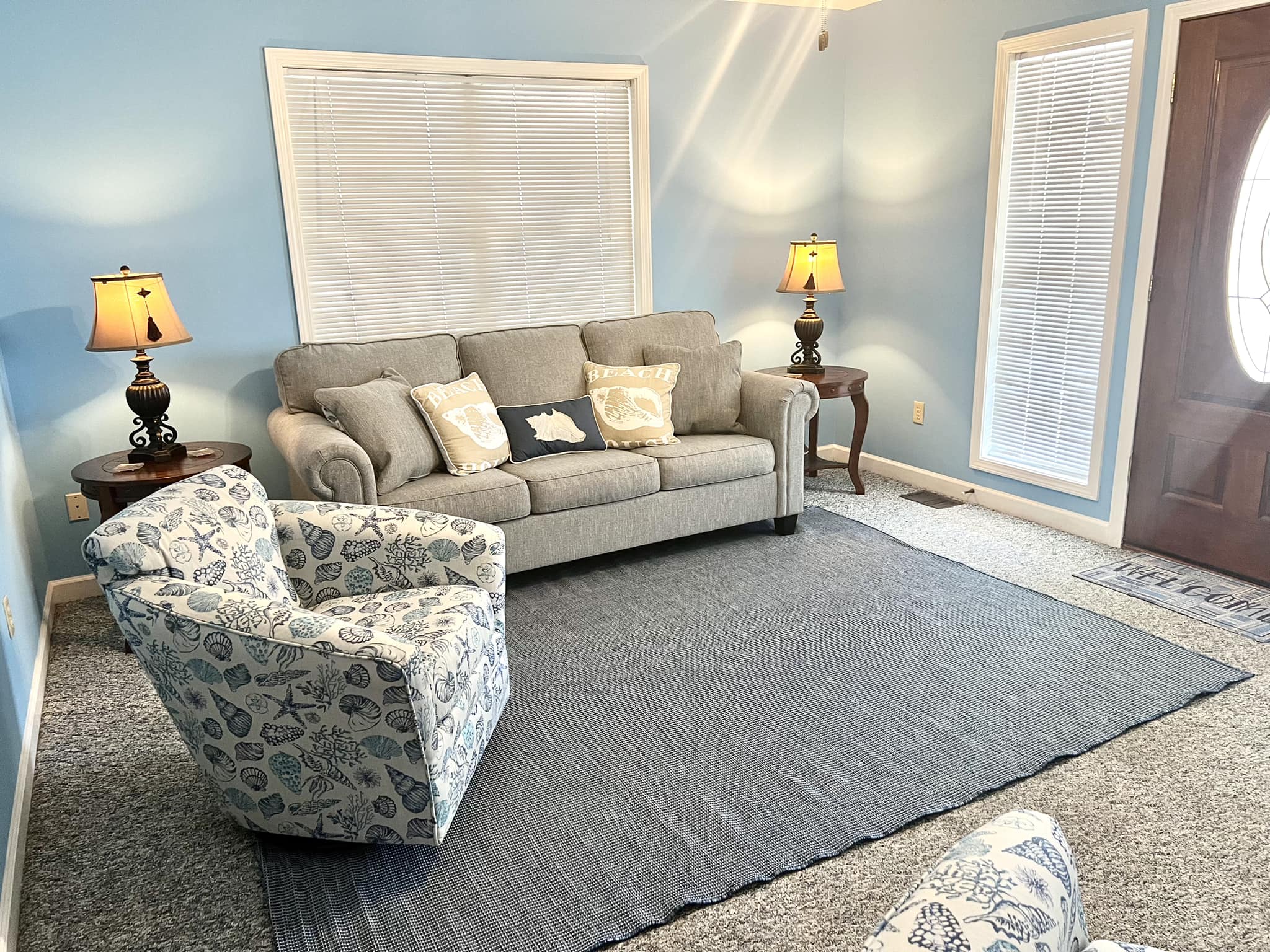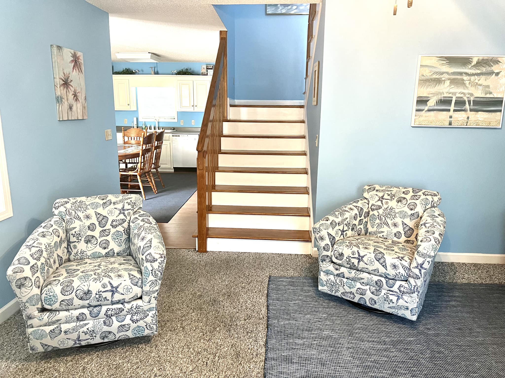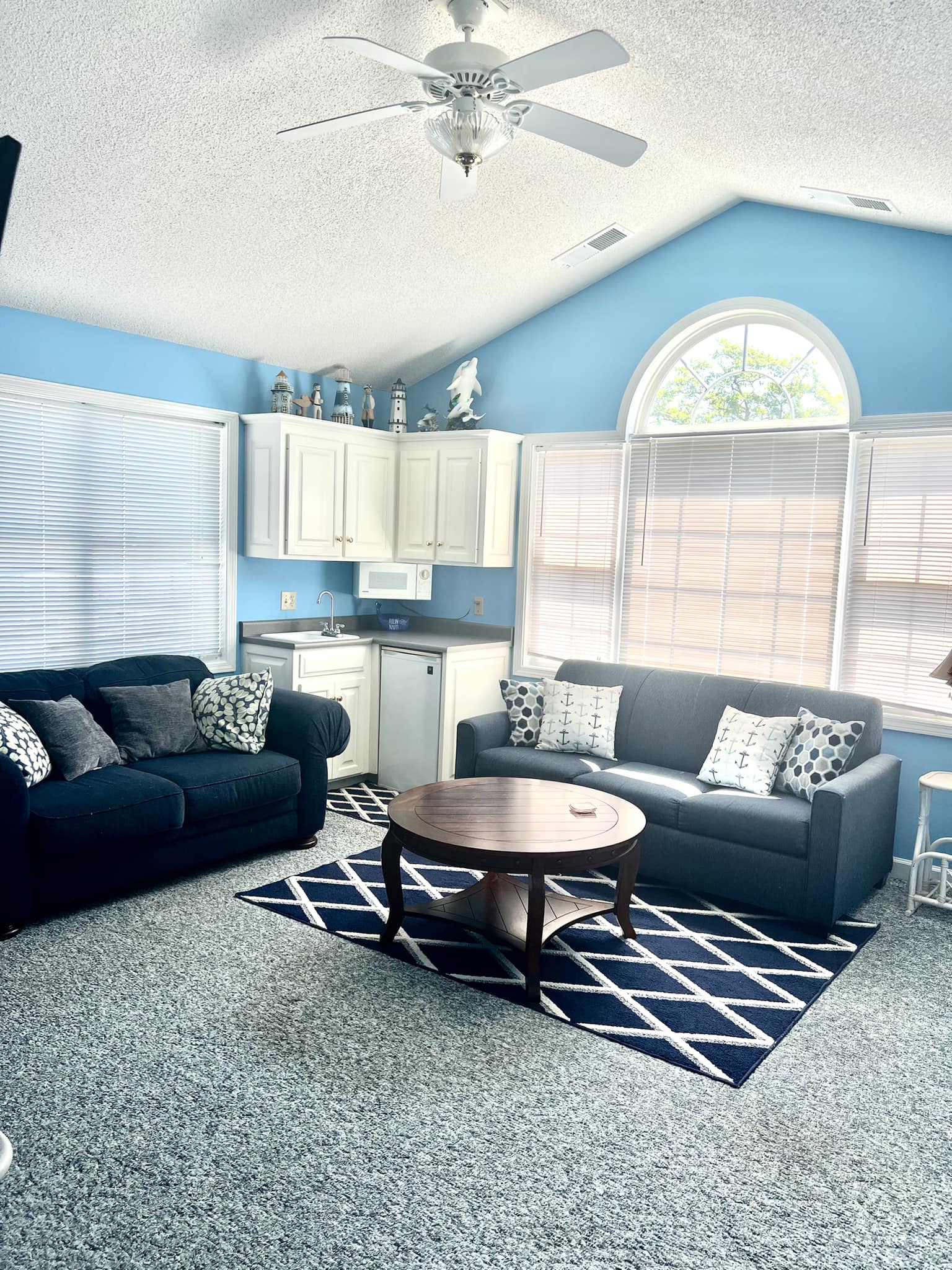 There are two separate living areas in this home, one on the main floor as well as one on the second floor which also has a bonus mini kitchen that includes a mini fridge, microwave, and sink.